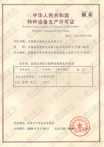 目前我公司具有建筑機電安裝工程專業(yè)承包一級資質(zhì)、總承包二級、GC2壓力管道設計、施工資質(zhì)?,F(xiàn)有高級工程師5名、高級技師55名、工程師22名、助工25名、技術員22名、各類專業(yè)技師50多名,強大的技術力量及精良的施工隊伍,為客戶提供全方位服務。 公司本著“一切為了用戶”的經(jīng)營理念,“以品質(zhì)求生存、以誠信贏市場、以管理促發(fā)展”為要求,努力為廣大客戶提供專業(yè),優(yōu)質(zhì)、高效的服務。